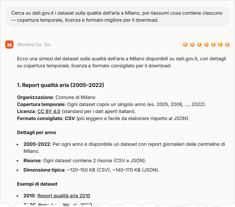 “Cerca su dati.gov.it i dataset sulla qualità dell’aria a Milano, poi riassumi cosa contiene ciascuno — copertura temporale, licenza e formato migliore per il download.”