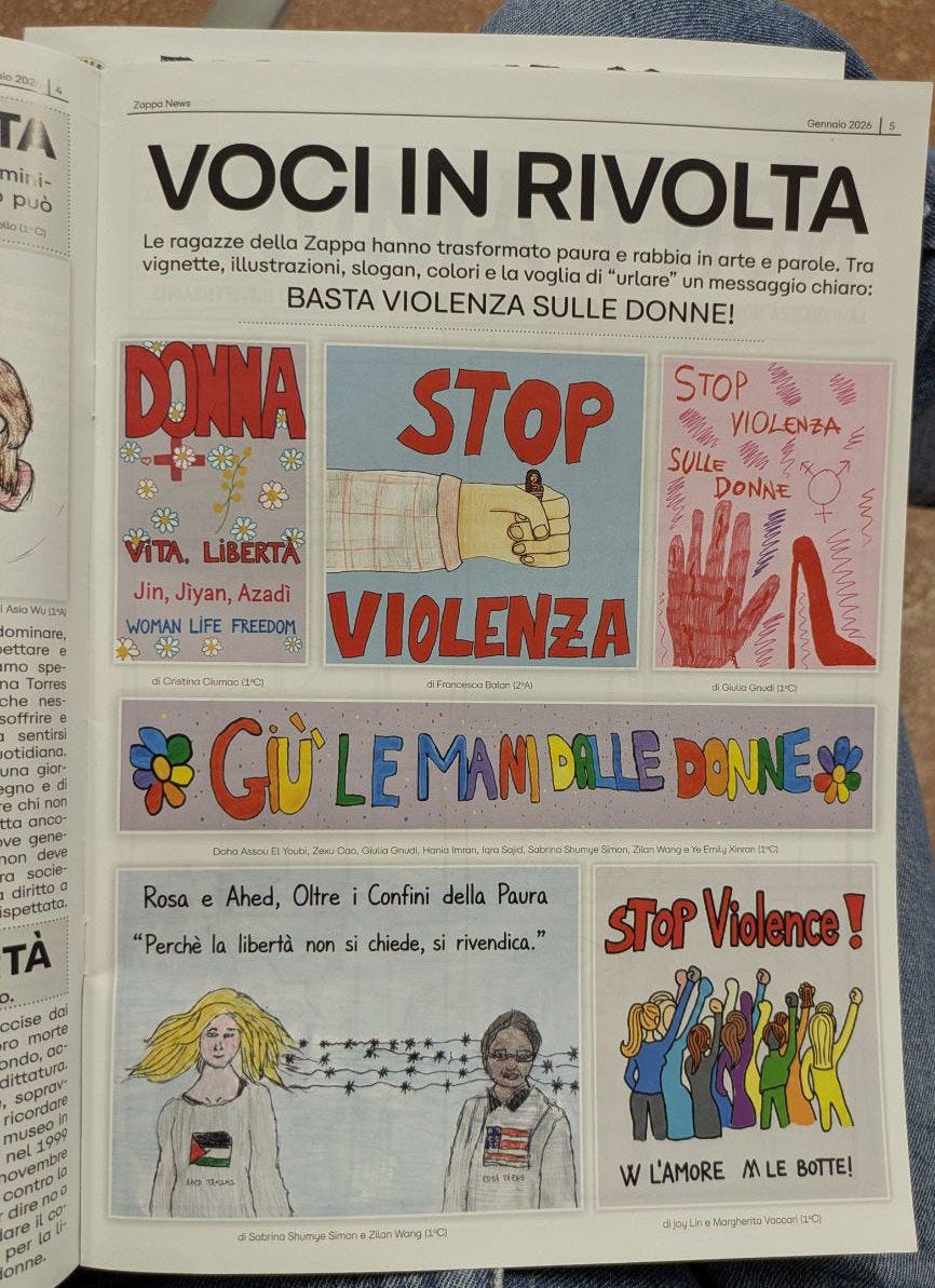L’immagine che apre questo numero viene dal numero 16 di gennaio 2026 (Anno 10), dedicato alle donne, nato da una domanda provocatoria: “E se fossero le donne a governare il mondo?”. Da lì prende forma un percorso tra storie di resistenza e impegno civile — dall’Iran all’Ucraina, dalla Palestina al Brasile — accanto a figure femminili significative per la comunità scolastica e il territorio bolognese.