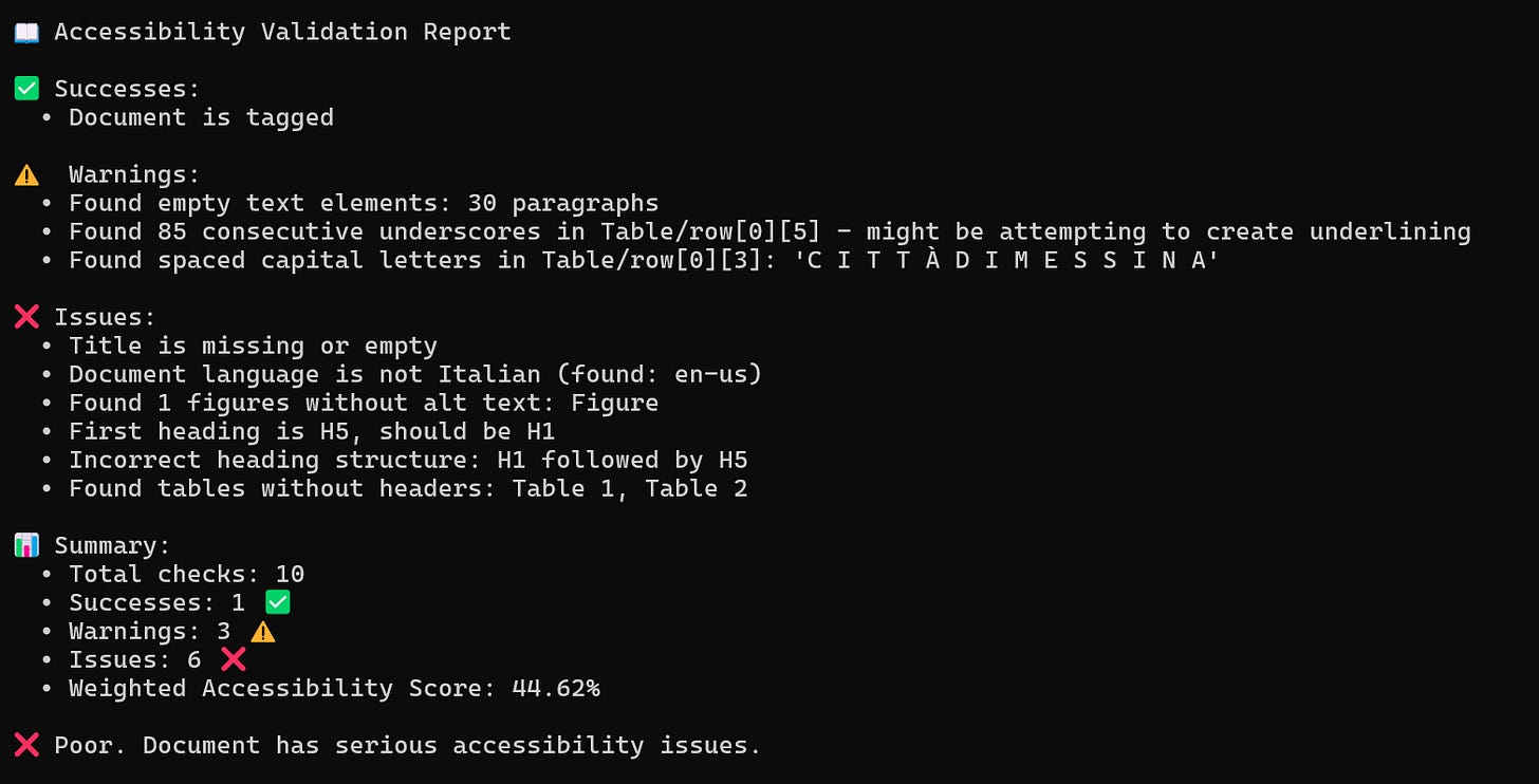 Dennis Angemi, nostro socio, ha costruito avalpdf: uno strumento da riga di comando per validare l’accessibilità dei PDF. Analizza la struttura del documento, verifica i tag, controlla la gerarchia delle intestazioni, l’alt text delle immagini, la struttura di tabelle e liste, la validità dei link e altro. Alla fine produce un report con errori, avvisi e successi, e assegna un punteggio di accessibilità.